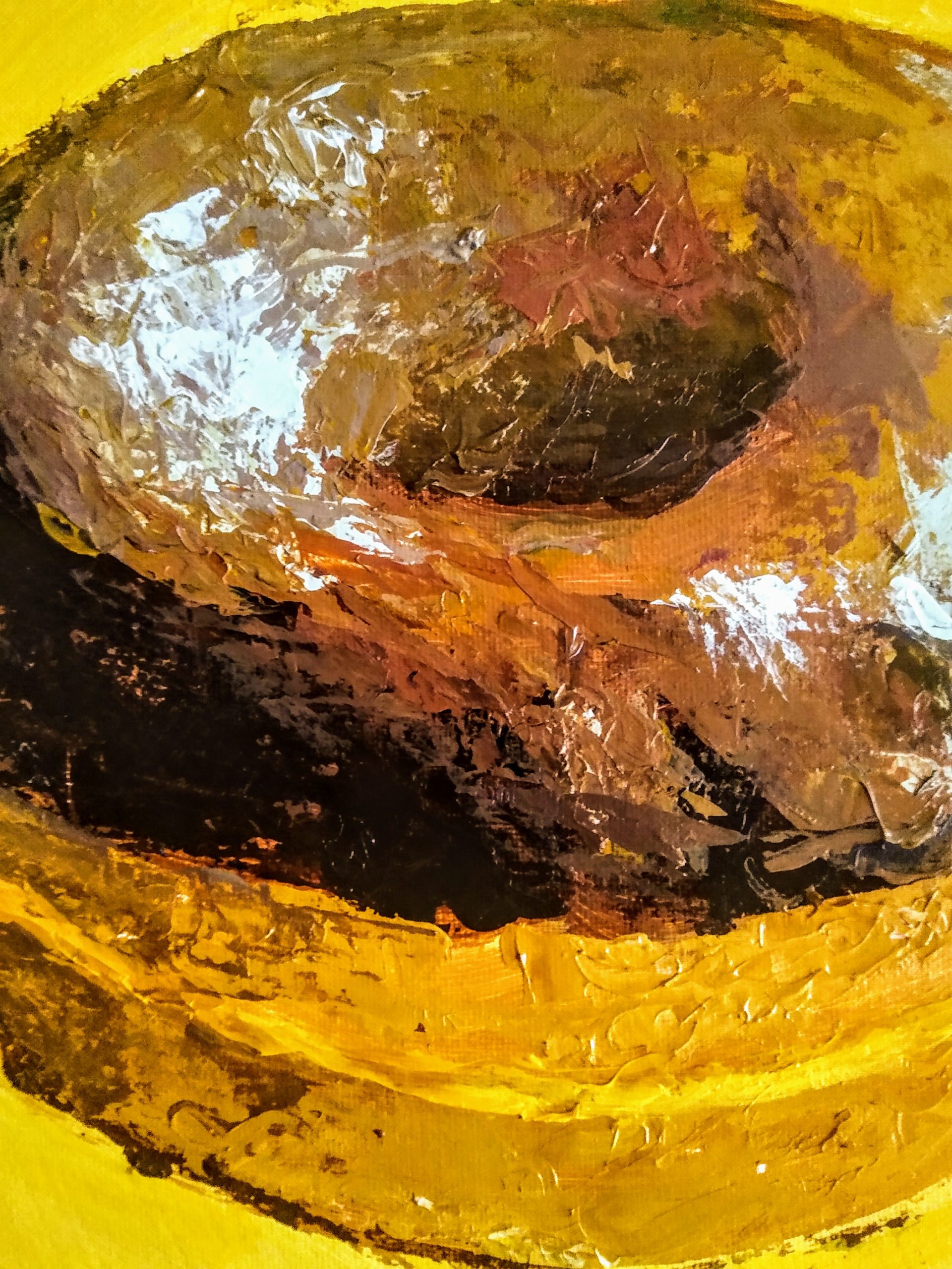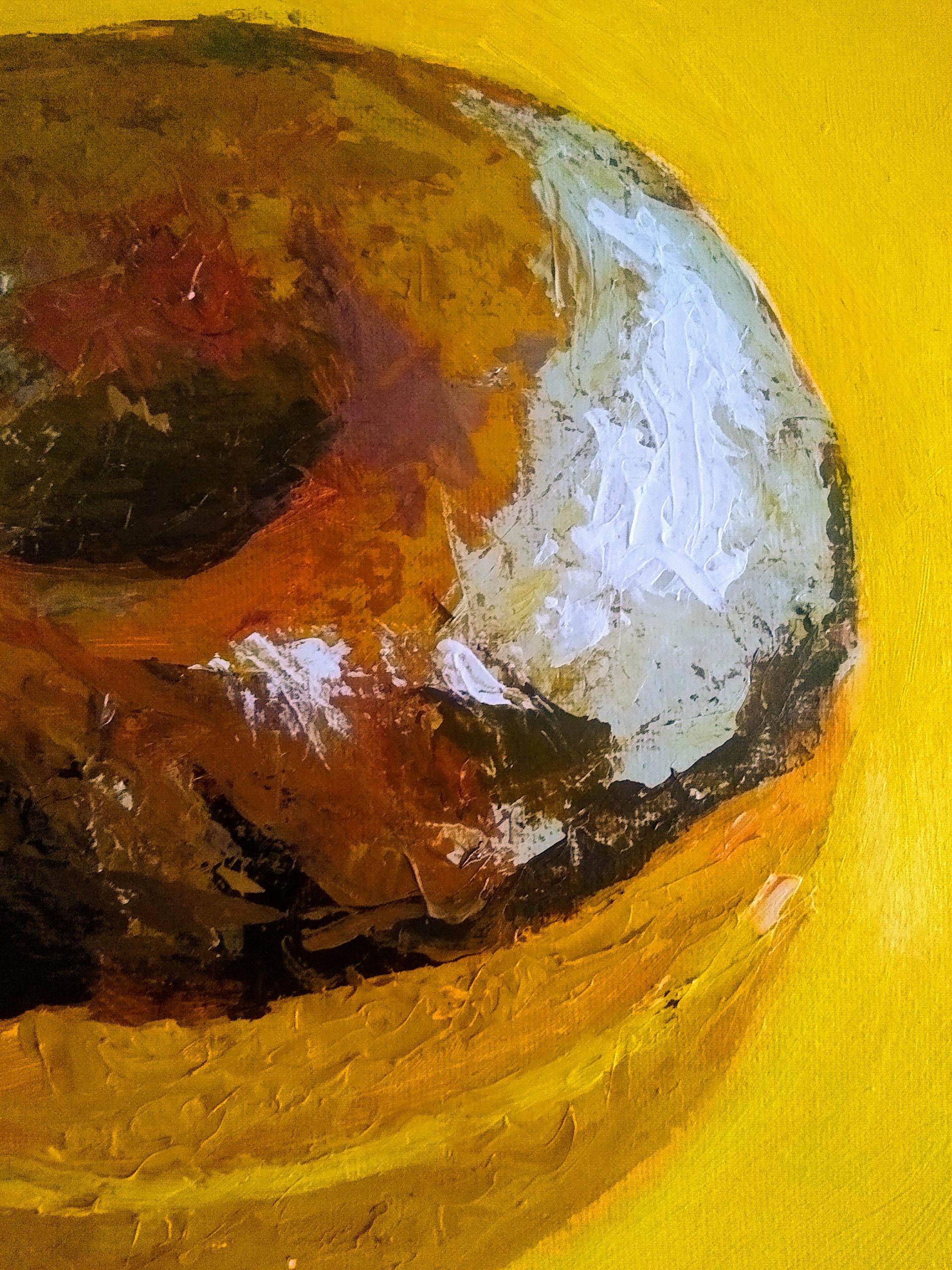Chocolate glazed donuts executed in acrylic with a palette knife. A familiar pastry rendered with bold color and texture.
